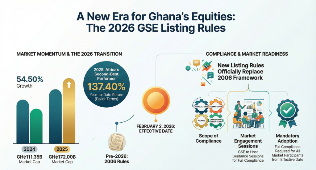 Quick Facts FeatureGhana Stock Exchange (New 2026 Rules)Effective DateFebruary 2, 2026.Preceding FrameworkReplaces the 2006 Listing Rules, representing the first major update in two decades.Scope of ApplicationApplies to all applications, submissions,…